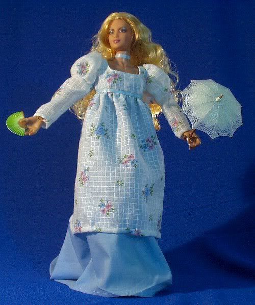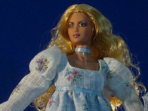 The dress was made to fit the Ertl Turkey Hunter body - which looks so much better sporting Mattel's Shakira head instead of its original noggin. I modified a Simplicity pattern to fit a CY-Girl-type body, and to have that sheer floral fabric overlay.