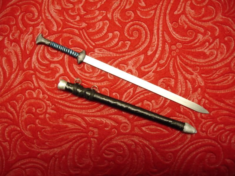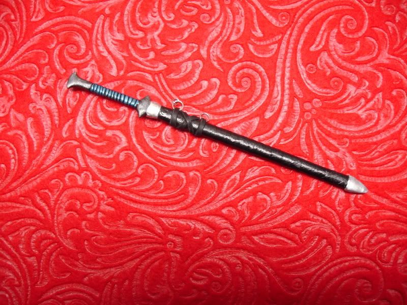 Here is my first try at using the straw-wrapped-in-floral-tape method for scabbards. Trimmed it with Apoxie, but, boy is that stuff difficult to use! A little paint and some leather sum up the parts.